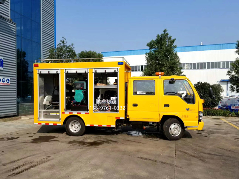 五十铃双排座工程救险车,可满足1200立方/小时的排水量,发电机组满负荷运转时间可长达12小时,满足设备长时间运行作业,该车机动性强,真正实现了移动应急排水、应急备用电源的概念,设备可满足紧急排水抢险、应急发电的需要,真正的实现一车多用。 主要配置:发电机组、进口大流量排水泵、静音厢体、车载空调、液压支腿、配电**系统、电缆绞盘、防爆照明灯、车载升降照明灯及抢险工具等。 | |