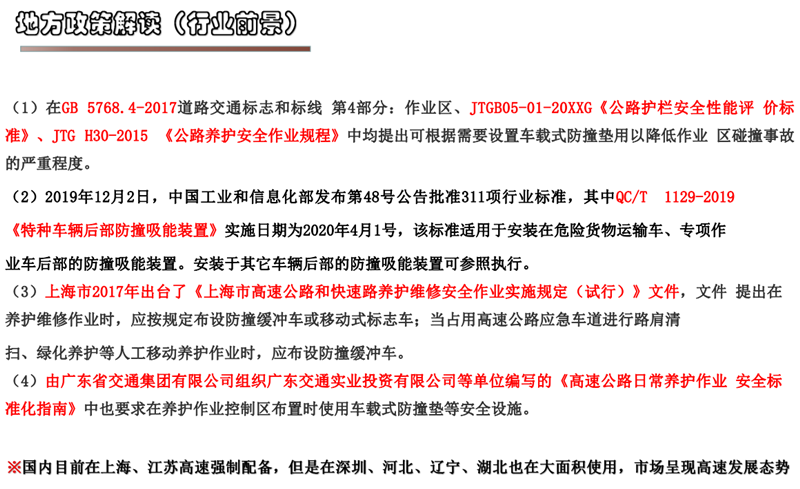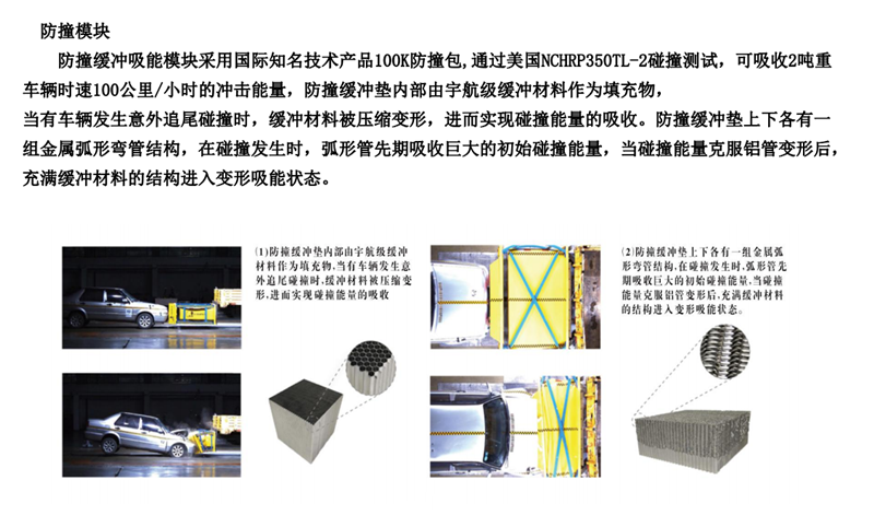 防撞缓冲车主要用于高速公路施工,隧道施工,公路施工。**大限度地降低了城市道路和高速公路养护施工中,施工车辆、养护人员和事故处理交**的安全风险问题。防撞缓冲车的防撞缓冲吸能模块主要由车载防撞缓冲垫和导向标志架组成,充当施工作业车辆后方的缓冲卫士。如若发生追尾事故,能够在肇事车辆和前方施工作业区域之间构建一个缓冲区域,通过机具结构变形吸收撞击的能量,**大限度地降低被保护人员及设备遭到碰撞的几率。